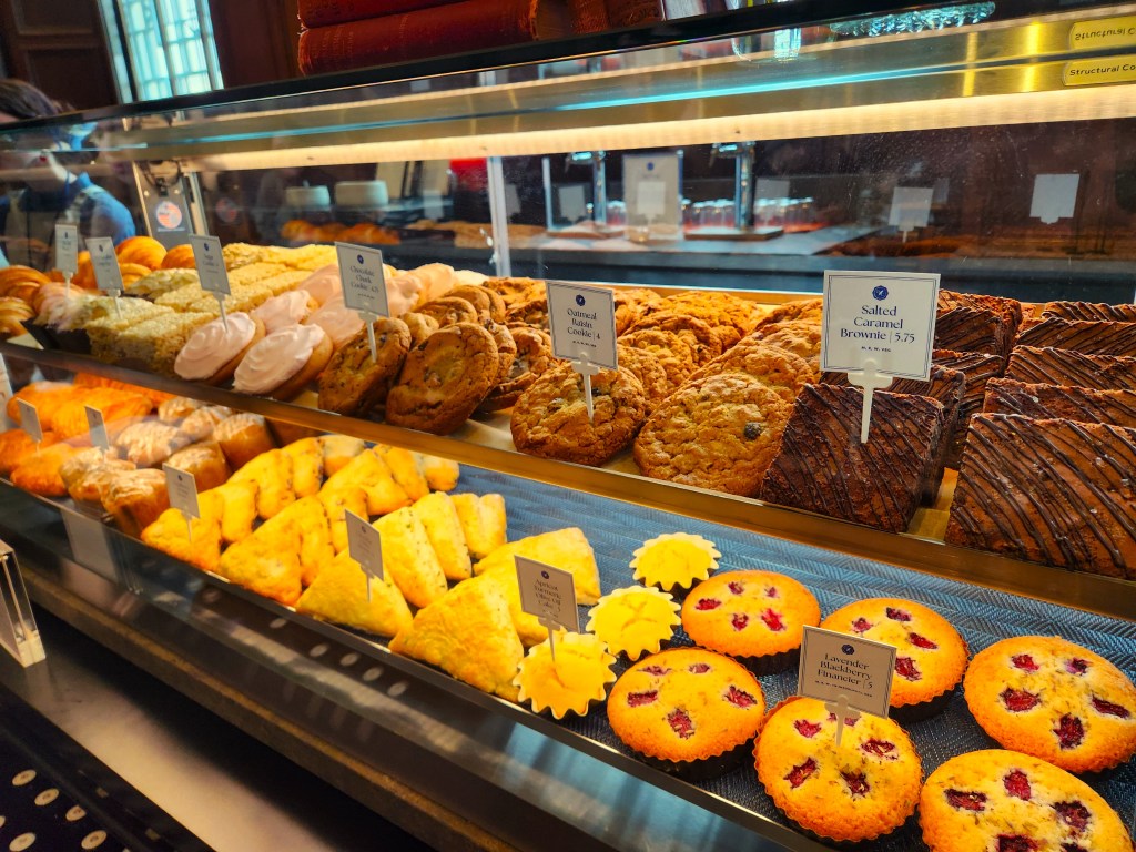 The menu features pastries like Lavender Blackberry Financiers and Pain Au Chocolat.