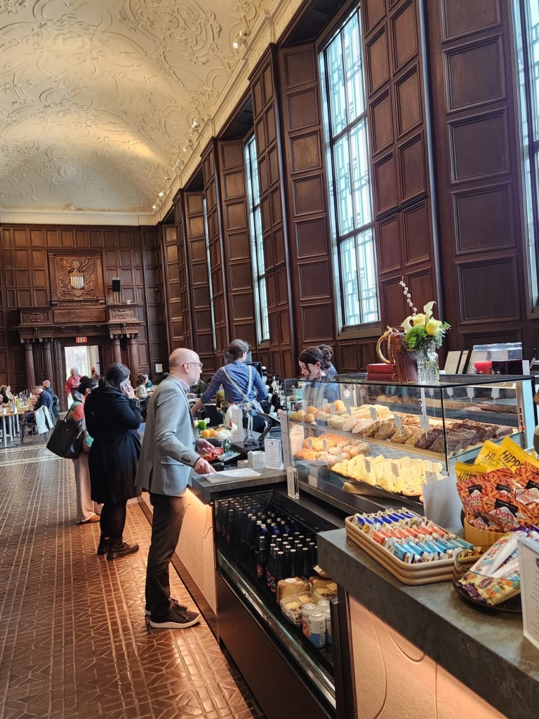 Quill & Crumb – the new Folger Library Café – opened at 11:00am on Friday. The café, located in the Library’s Great Hall, is all about space and light. Patrons will feel welcome despite being in a somewhat formal atmosphere with dark wood paneling, huge windows and a soaring ceiling. The entrances to the café are through the east and west lower terrace entrances.