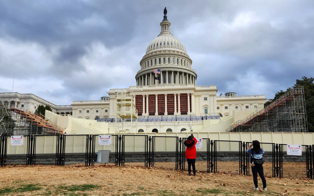 Status Report on the Inaugural Platform. Construction continues on the West Front of the US Capitol. As seen in the photo, the structure on the far left is the radio platform from which audio correspondents will broadcast live coverage of the ceremony. Just to the left of center, the narrow white structure is the Center Camera Stand, where the network pool will provide head-on video coverage to other news subscribers who do not have cameras on this platform. Other occupants of the structure will be network cameras (ABC, CBS, NBC, CNN, FOX) providing unilateral coverage as well a C-SPAN camera and official video cameras. Also on this platform will be still photographers from major news organizations. On the far right, the South Camera Stand will be home to additional network cameras, video cameras from the major network and independent news organizations, and more still photographers.