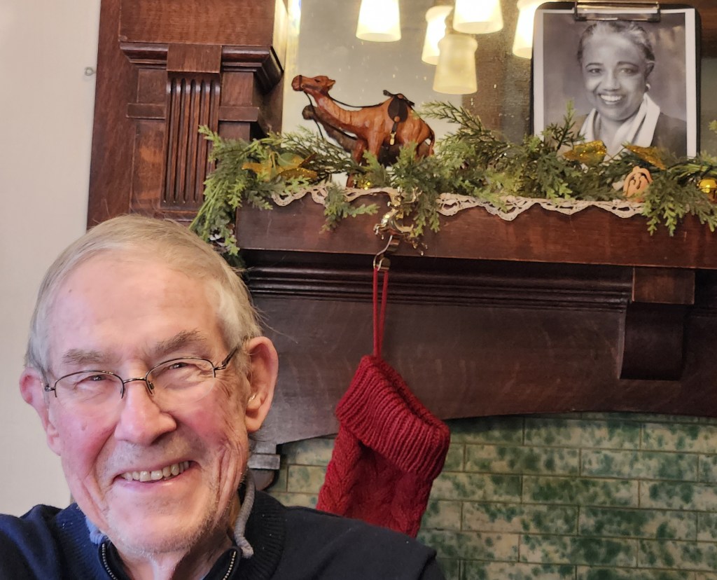 Joe Cooney on December 30, 2024, at his home on South Carolina Avenue, SE. On the mantel behind him is a photo of his late wife, Lovey Marie Guillory.