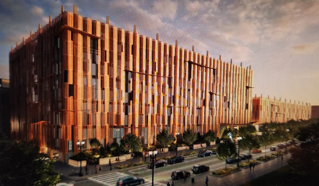 Currently, the façade has three layers – a security barrier, an opaque window wall system, with the exterior covered by a decorative perforated screen or “scrim” of pre-weathered Corten steel panels. Moldenhauer said the intent was to make the façade look like “leaves and trees with a ‘scrim’ over the top.” One of the critiques from CFA was that the Coren steel might darken over time presenting a more threatening visage to the community.