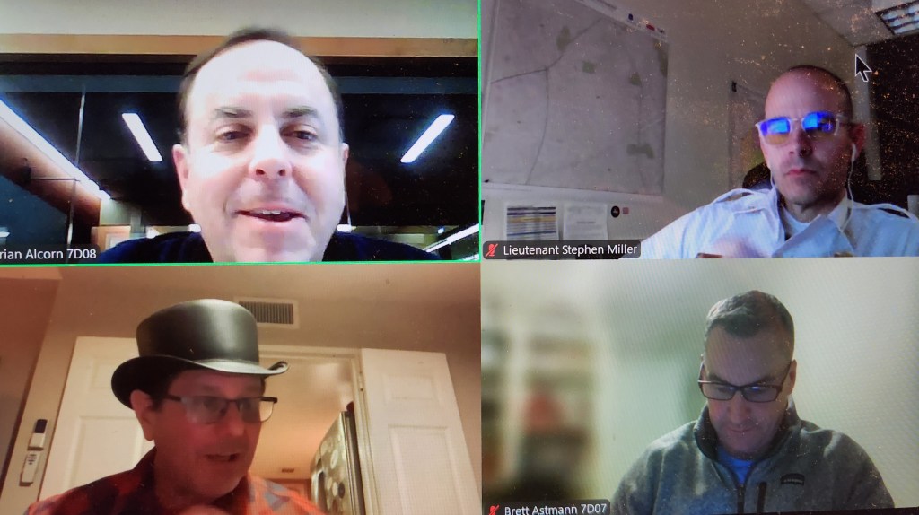 ANC7D also met on January 14 and elected new officers: Chair, Brian Alcorn (upper left); Vice Chair, Mike Davis; Treasurer, Brett Astmann (lower right); and Secretary, Dev Myers. Also shown is MPD Lt. Stephen Miller (upper right), and wearing chapeau at lower left, Andrew Lightman, recruited by ANC7D as a non-member of the commission, to offciate at the election.