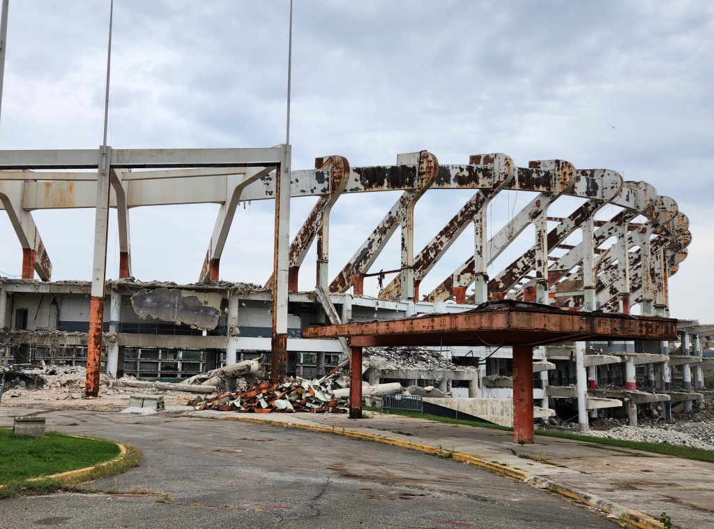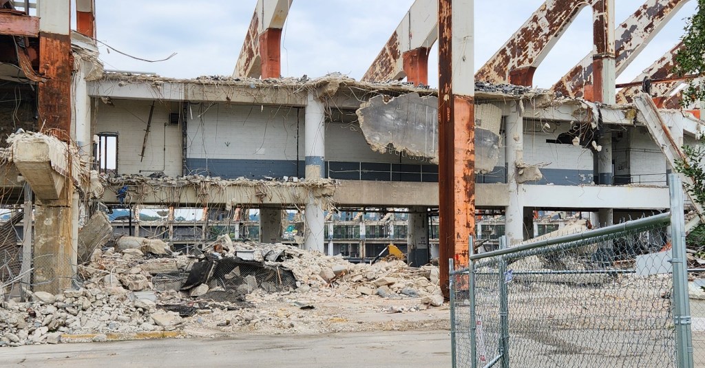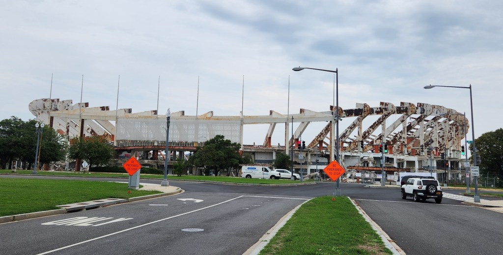 The demolition of RFK Stadium started in early 2025 and is scheduled for completion in fall of 2026. Currently, it resembles the skeleton of a beached whale. Here’s a link to the DC RFK Demolition website which has a link to the live demolition camera atop DC Armory. https://eventsdc.com/venue/rfk-stadium/rfk-demolition-updates The photos are from Wednesday, September 24.