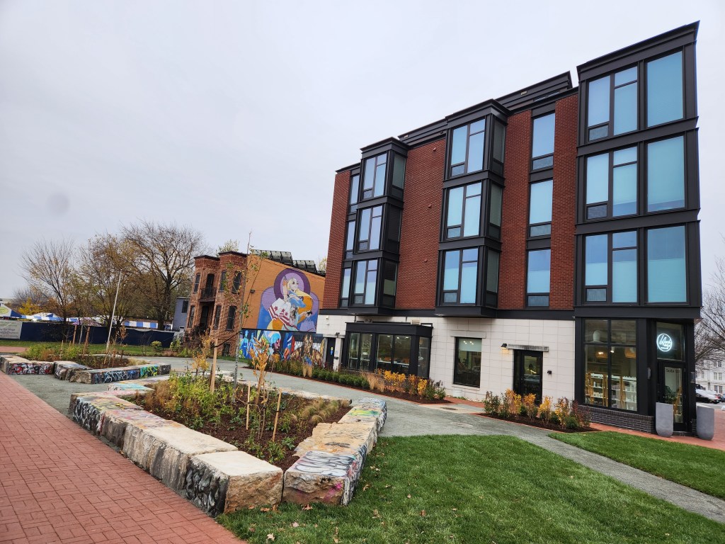 Blackbird Salon at 8th and Virginia Avenue, SE (which occupies the ground floor corner space at far right in the photo) was probably happy to see the city’s treatment of the scruffy empty lot in front of their store. When the city cleaned up the pile of cut stones salvaged from the demolition of the CSX tunnel and stored underneath the freeway next to Garfield Park, they moved them to this corner. Over the past month, they became the basis for a landscaping project.