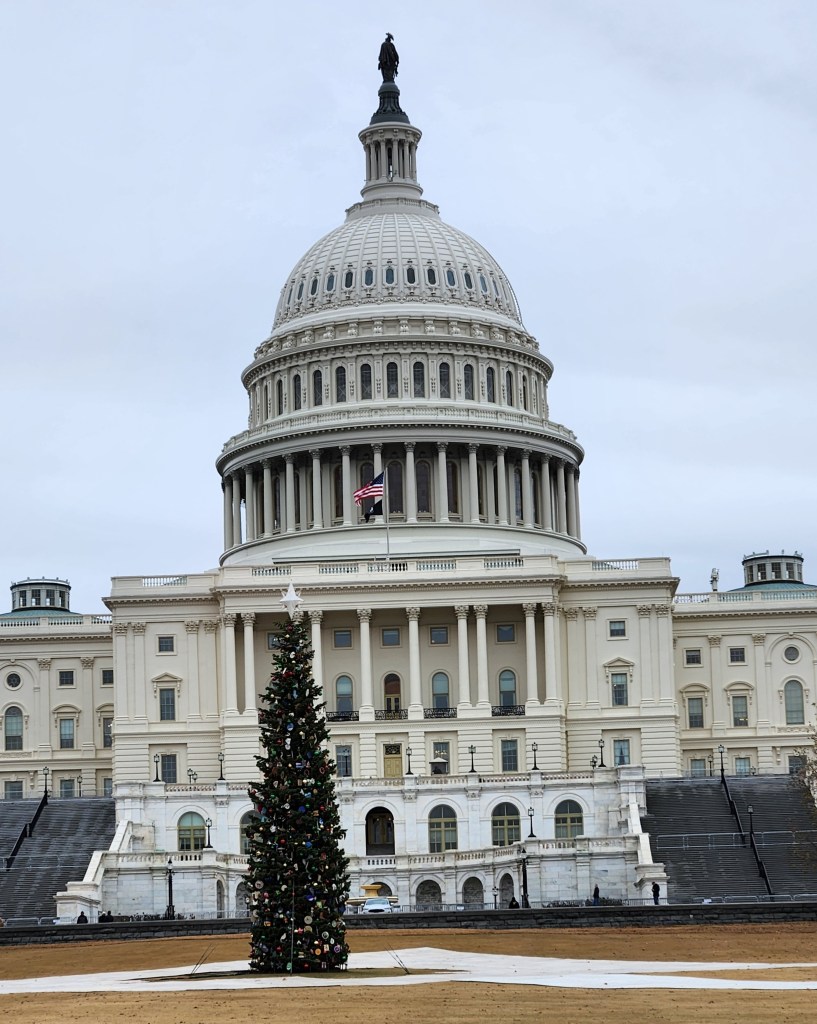 Here’s the 2025 Congressional Holiday tree – a 53 foot Red Fir from Nevada – awaiting its illumination at 5:00pm on Tuesday, December 3. If you’re think that this year’s tree sooks smaller than last year’s tree, you’re correct. Last year’s tree was an 80 foot Sitka Spruce from Alaska. The tree will be lit from dusk until 11:00pm, through January 1.