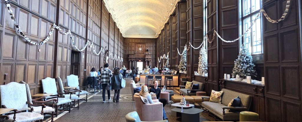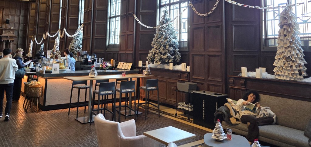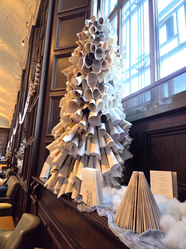 As CHC has noted elsewhere in reference to artist Anke Neumann’s spectacular handmade paper sculpture in the East Stairwell, paper means everything to the Folger. That theme is carried forward in the holiday decorations in the form conifers formed from cones made of pages of text from Shakespeare’s plays. And carried further by the decorations around the trees formed from more pages of Shakespearean text.