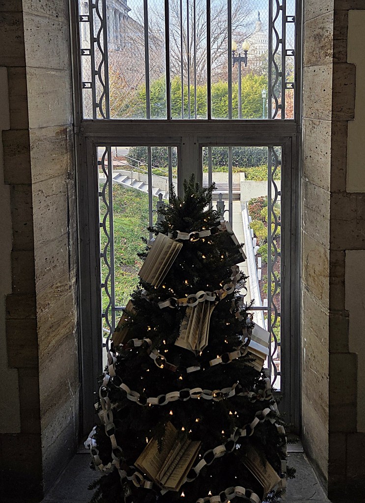 A holiday tree over the East Entrance to the Folger is framed by the Library of Congress and the dome of the US Capitol.