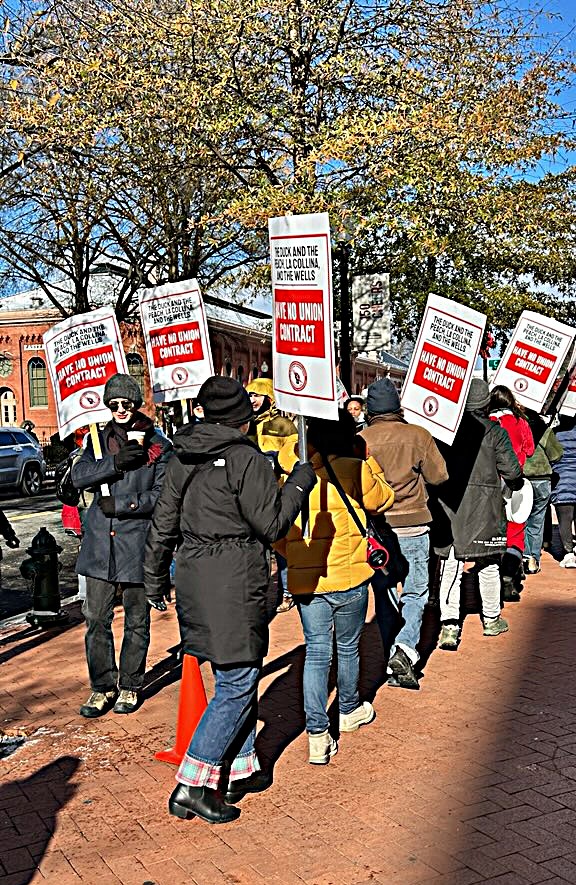 Pro-union demonstrators were on the plaza outside Duck & Peach on Sunday morning. The signs read: “The Duck and Peach La Colline and The Wells Have No Union Contract.” Photo credit – Bob Gellman.