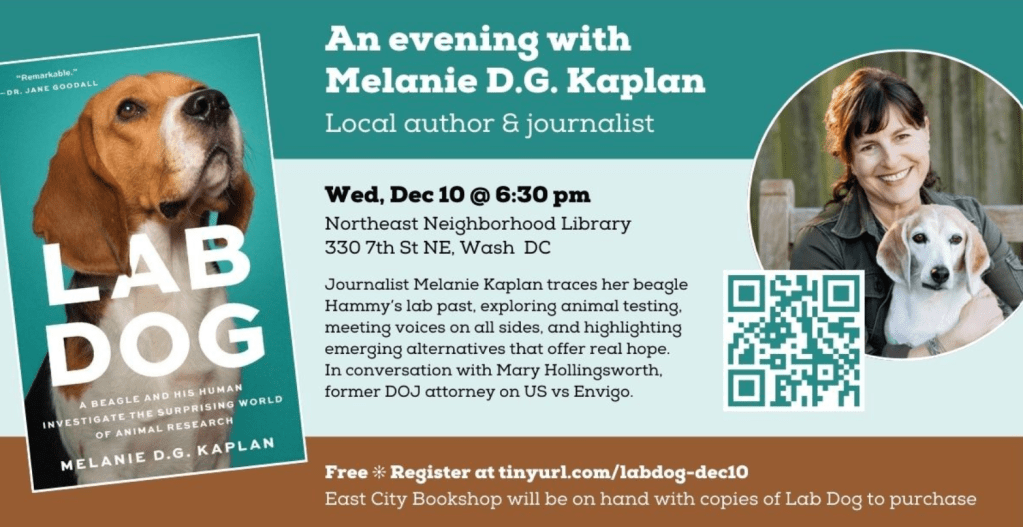 Capitol Hill author and journalist Melanie Kaplan discusses her book about her beagle Hammy’s laboratory past in conversation with Mary Hollinsworth, former DOJ attorney on US vs Envigo. The case resulted in a historic resolution where the animal breeder’s entities pleaded guilty to felony conspiracy charges related to violating the Animal Welfare Act and the Clean Water Act. This followed a 2022 federal investigation and civil suit that led to the rescue and surrender of over 4,000 beagles from their facility in Cumberland, Virginia.