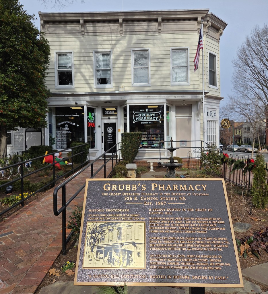 Finally, there’s a new plaque in front of Grubb’s Pharmacy at 326 East Capitol Street. It commemorates Grubb’s status as the oldest operating pharmacy in the District of Columbia, dating to 1867.