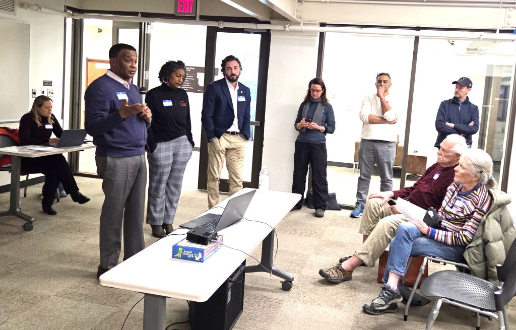 CM Charles Allen with meeting organizers ANC6A Chair Amber Gove and East Capitol Resident Suneel Kudaravalli at last Saturday’s Community Meeting on Power Surges.