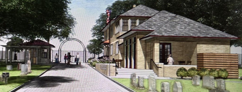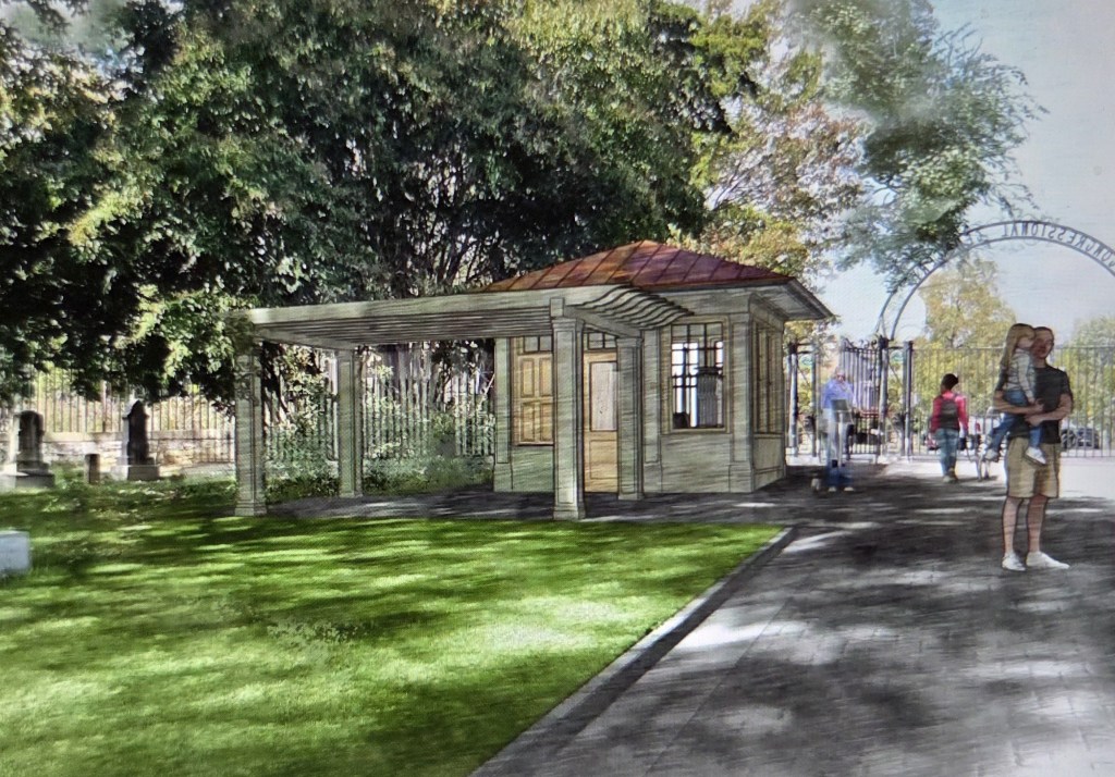 Here’s a view of the new kiosk which will be an orientation point for the cemetery and have a fulltime staff member to take check-ins for the local canine group and possibly a gift shop and pamphlets for self-guided tours. There will also be lockers for docents who do volunteer tours at the site. The pergola will be a shade structure for the golf cart used to navigate the site and help people with limited mobility.