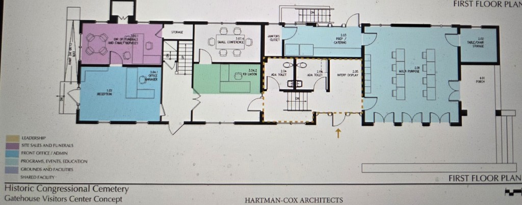 At ANC6B’s Thursday night meeting of the Planning and Zoning Committee, Mark Hudson, Executive Director of Congressional Cemetery, (bottom, center) introduced Hartman-Cox Architects to present concept designs for the renovation of the cemetery’s gatehouse, garage, kiosk and pergola. The cemetery’s current vision is to be more community focused with more space for education and community engagement facilities.