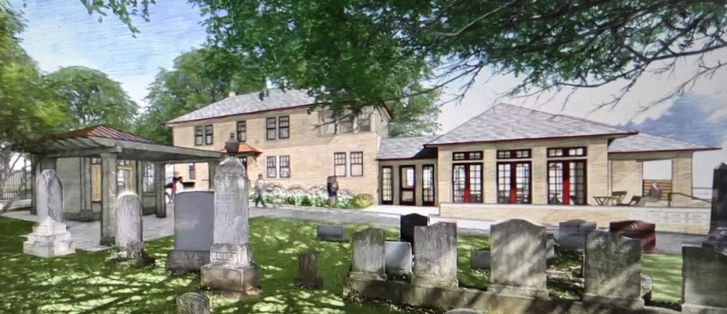 Here’s a view of the proposal from the west side of the building. The existing porch and garage will be removed. A new structure on the garage footprint will have restrooms, an interpretive display, a kitchen, and multipurpose space. The entrance to the new structure will be in the middle. A terrace in front will will be a launchpad for groups visiting the cemetery.