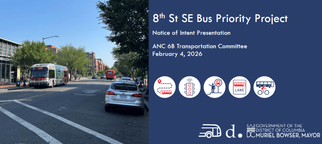 8th Street Bus Priority Project Update: Last Wednesday night, ANC6B’s Transportation Committee heard a presentation from Project Manager Andrew Grinsberg – a briefing required after DDOT’s issued a Notice of Intent on the project’s proposed traffic and parking modifications. One of the results of the proposal will be the loss of 31 parking spaces between East Capitol and M Street, SE (4.5% of total available parking between East Capitol and M Street SE) – mostly on Barracks Row. Comments on the proposed changes will be accepted through February 27th at the NOI Portal, here: https://ddot.dc.gov/service/notice-intent And here’s a link to the website with the presentation DDOT gave to the Committee on Wednesday night. A link can be found under “Documents” about half way down the page. https://buspriority.ddot.dc.gov/pages/8thstse#documents The committee unanimously approved a motion to support the project. The letter of support now goes to the full ANC at its next meeting on Tuesday, February 10. Image DDOT
