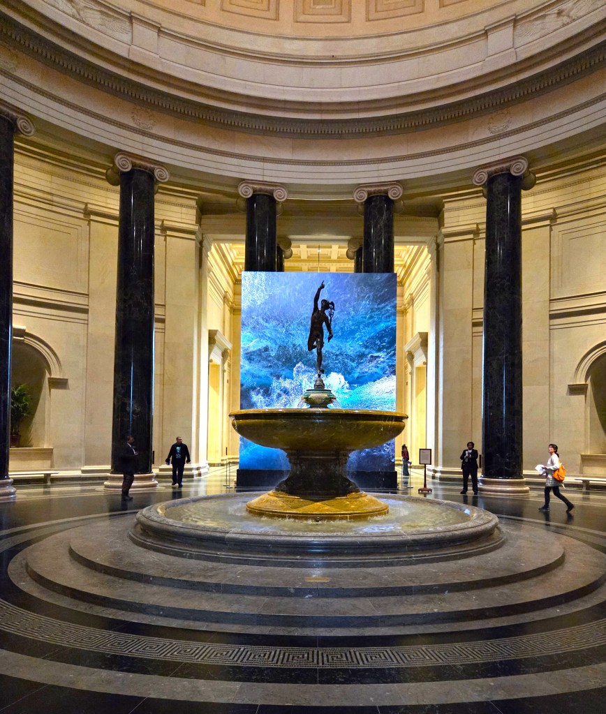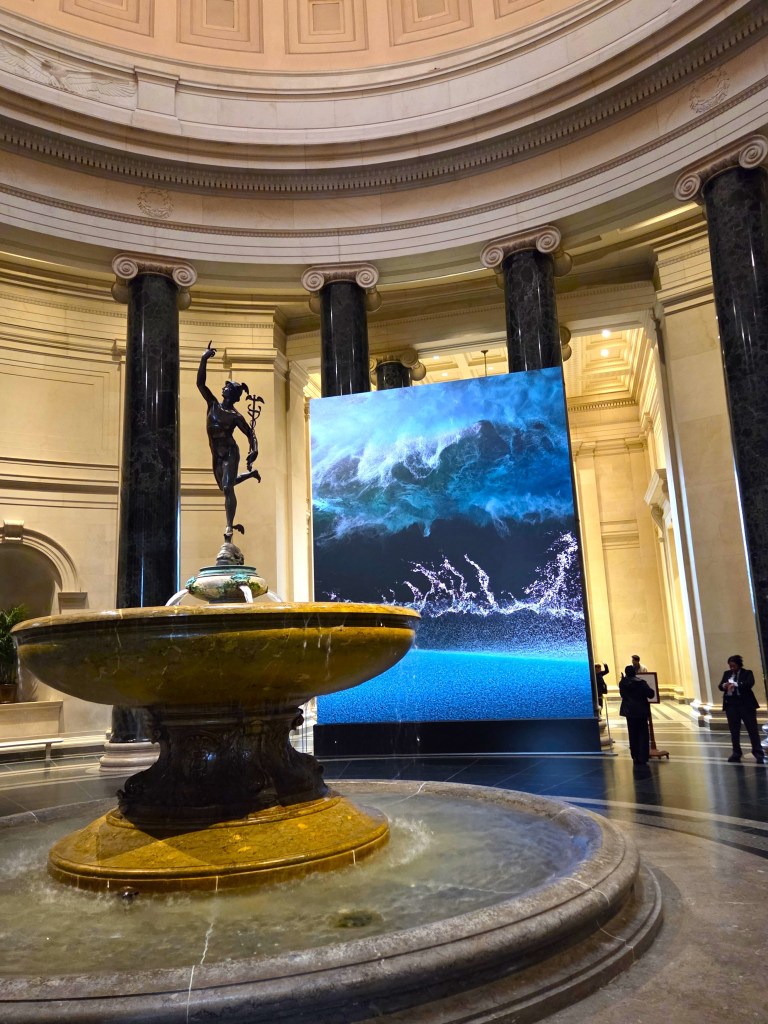 Here’s the view as one enters the National Gallery’s West Building Rotunda from the Mall Entrance. Behind the sculpture of the Roman god Mercury is a massive screen showing “Digital Waves” – a computer-generated video.