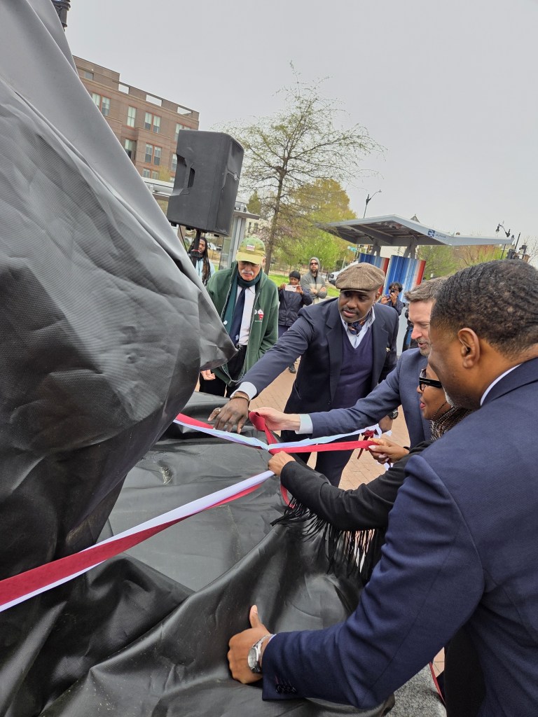 Sculptor, Jay Coleman (center) helped the city officials present which included (left to right) ANC6B Commissioner David Sobelsohn, Coleman, CM Allen, DPR Director Thennie Freeman, and DGS Director Delano Hunter unveil the piece.