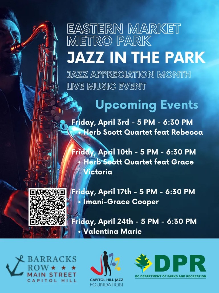 The concert series comes to Eastern Market Metro Plaza through the efforts of Barracks Row Main Street and the Department of Parks and Recreation. CM Charles Allen secured funding in the current FY DC Budget to program the performance space at the Plaza.