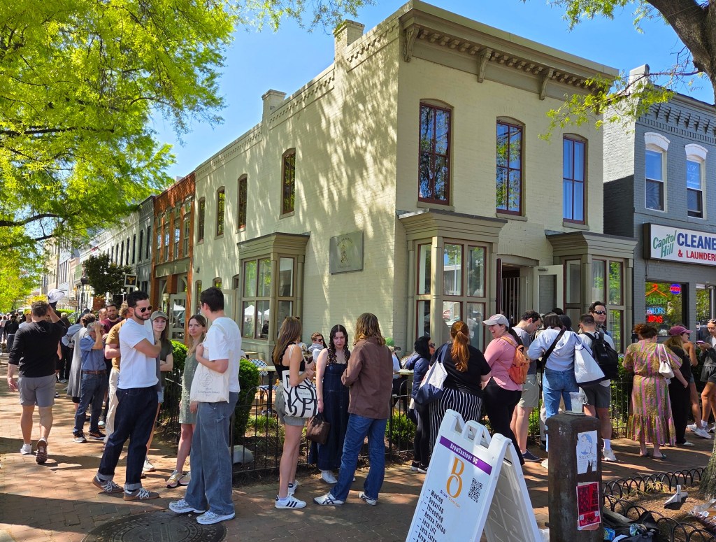 Boulangerie Saint Georges at Eastern Market opened Saturday morning at 7:30am, offering house made pastries, breads, sandwiches and coffee. Here’s a photo at noon, with more than 50 people waiting in line. At times, the wait was two hours+ to get inside.