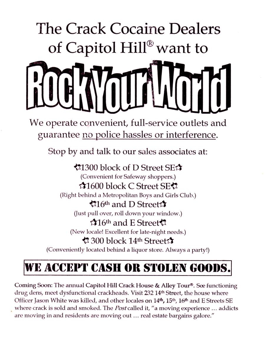 Copy of one of 3,000 flyers posted by Myers and others in 1998 “all over the city” to focus authorities’ attention on Hill East drug issues