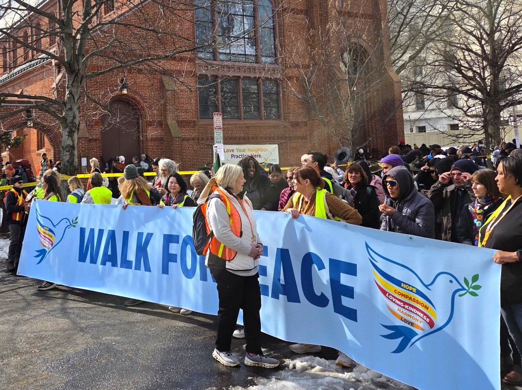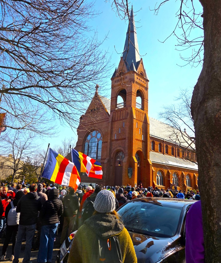 The next day, the monks continued to Annapolis, visited the steps of the Maryland Stare House, and then departed by bus to return to Fort Worth. They arrived on Saturday, February 14, for a peace gathering and celebration of the completion of the journey.