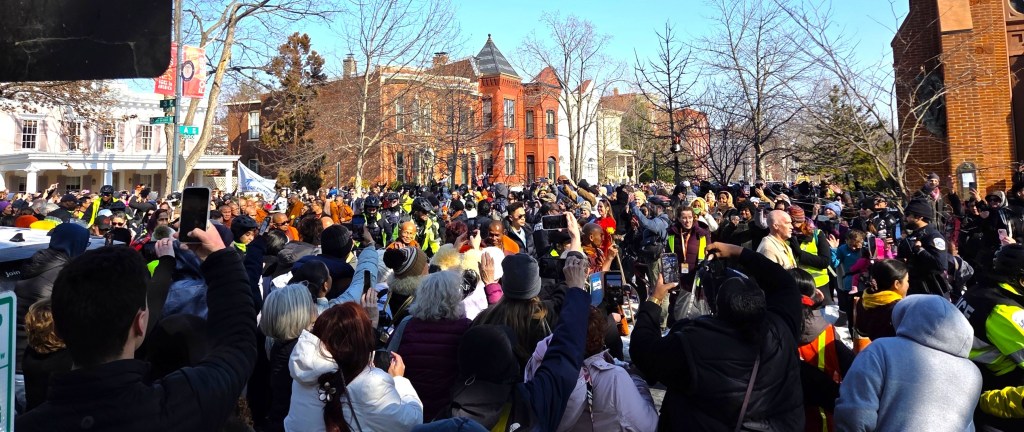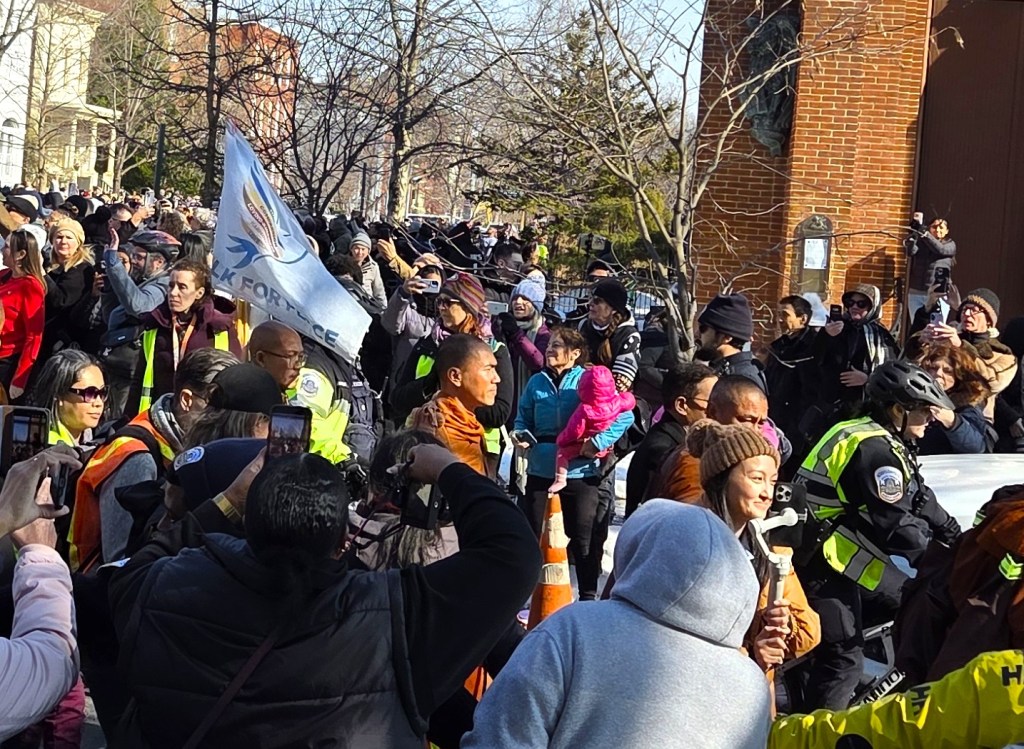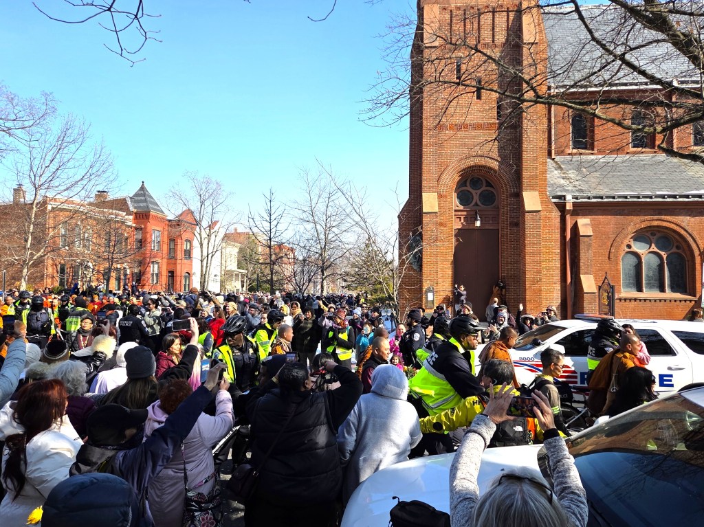 Last Wednesday, 19 Buddhist monks who travelled the 2300 miles on a four month Walk for Peace from Fort Worth, Texas to Washington, DC arrived at St. Mark’s Church on Capitol Hill, at 301 A Street, SE. This photo is after their 11:00am arrival while they were in the church for lunch.T here were some 400 monks, organizers and supporters inside the church and more than 1000 in the street and lining it outside, including security, organizers, and members of the public.