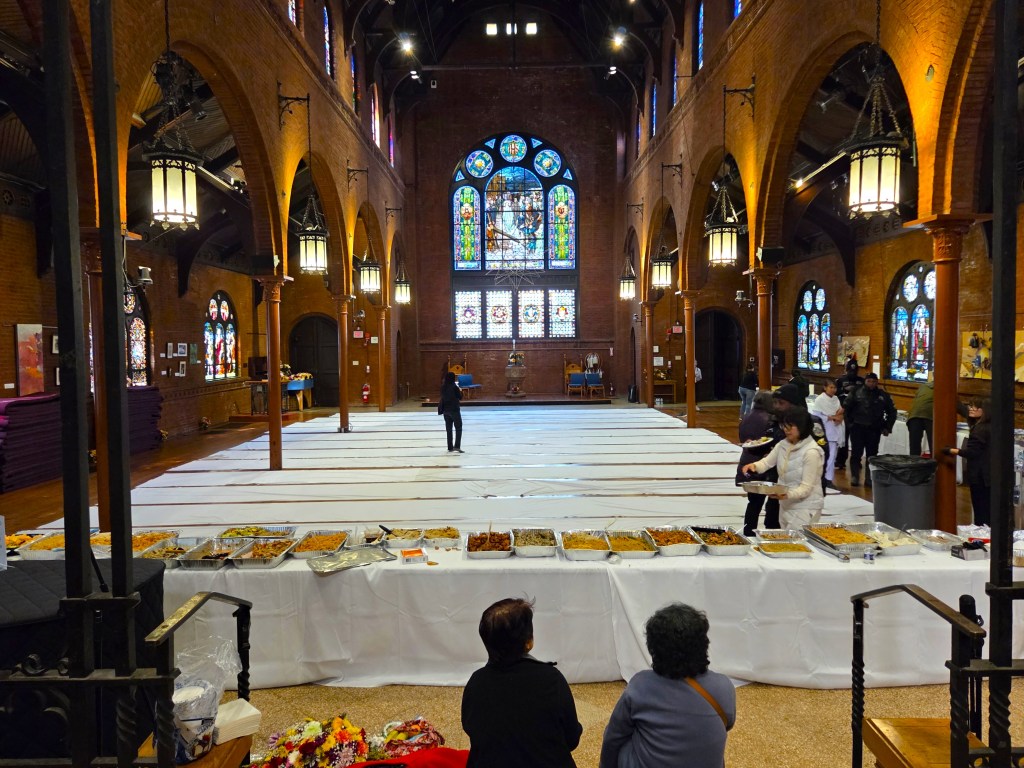 Here’s a photo inside the church after the event. The nave of the church had long tables of catered food in the front and on one side. The entire floor of the church was covered with long strips of white cloth where the monks sat while they had lunch. One of the organizers said that 400 had been served.